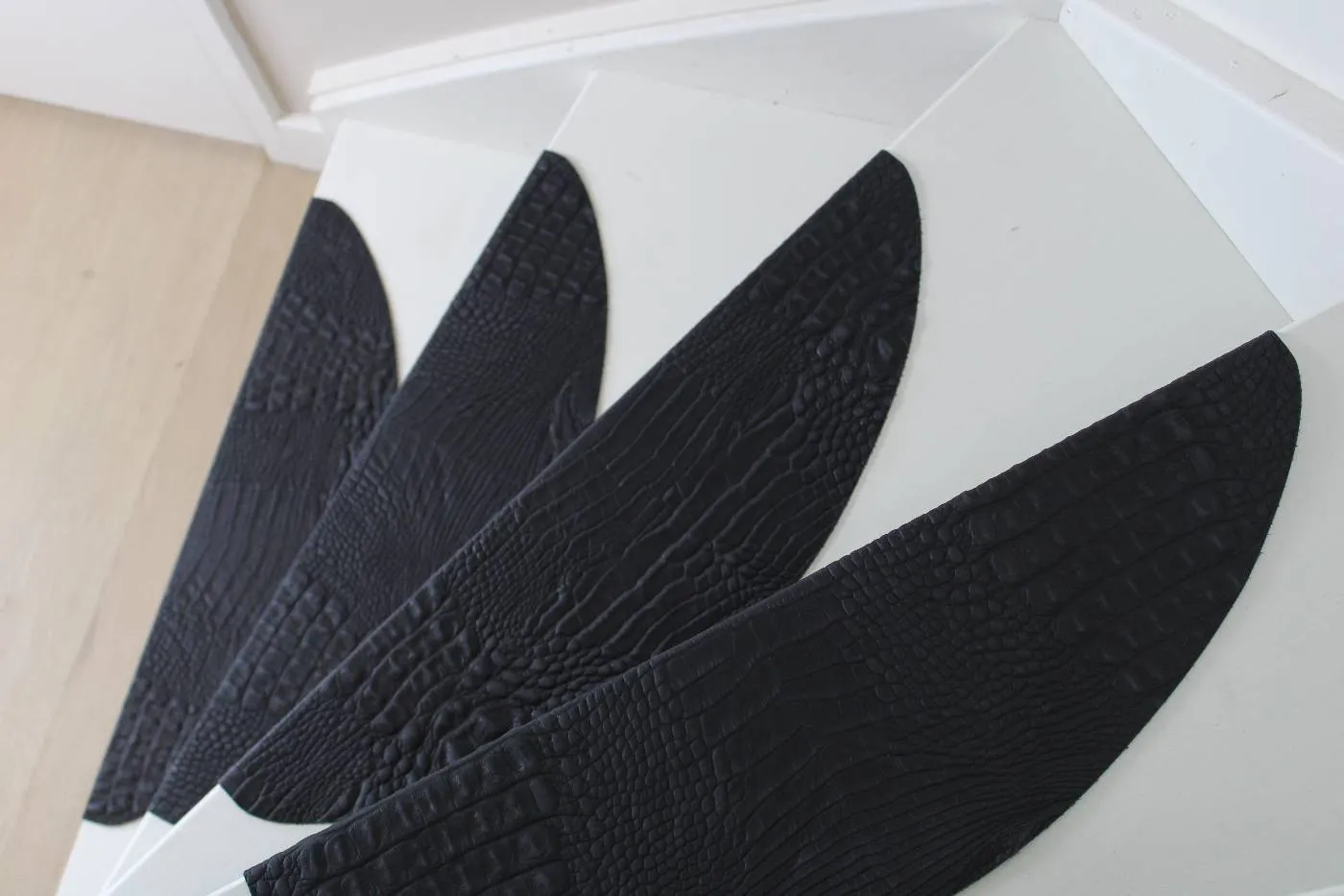 Zwarte leren trapmatten met croco-print zorgen voor een luxe en opvallend accent op je trap. De dertien matten van duurzaam leer met subtiele croco-structuur blijven soepel en behouden hun kleur bij intensief gebruik.