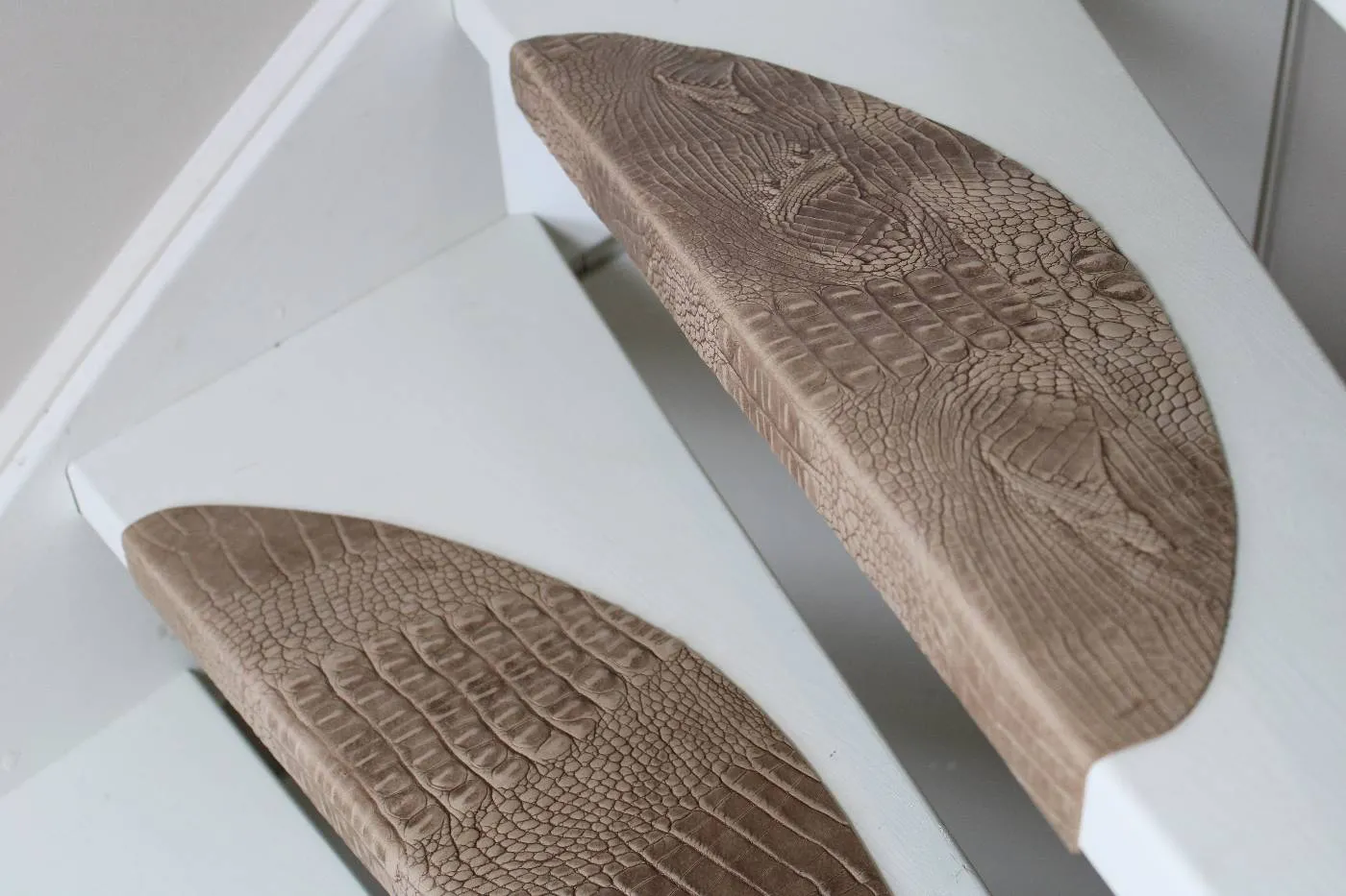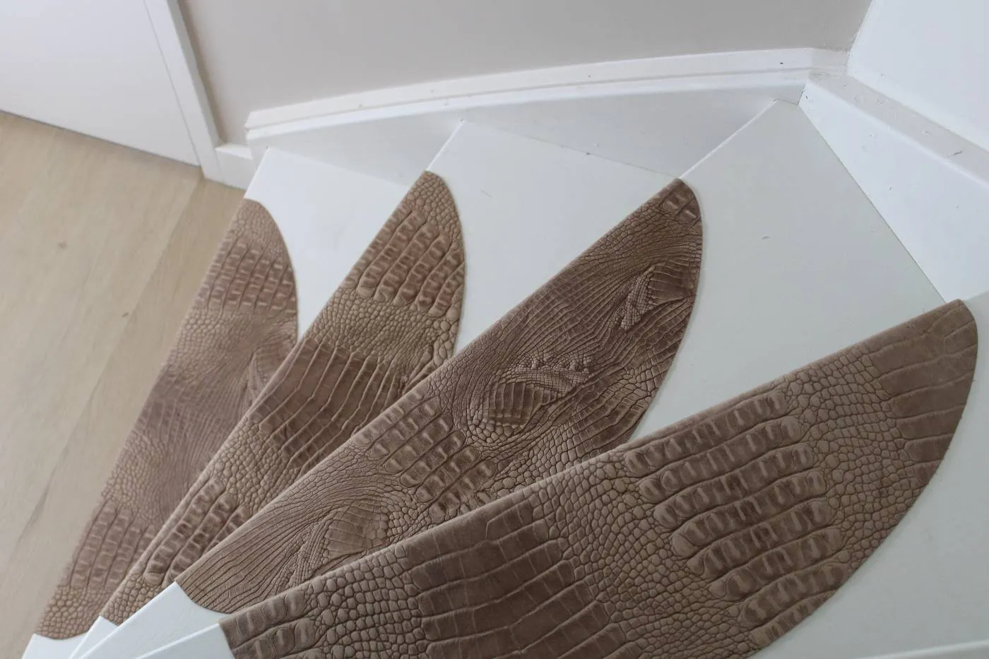 Leren trapmatten in de kleur sand met croco-print geven je trap een luxe en karaktervolle uitstraling. De dertien matten van duurzaam leer met subtiele croco-structuur blijven soepel en behouden hun kleur bij intensief gebruik.